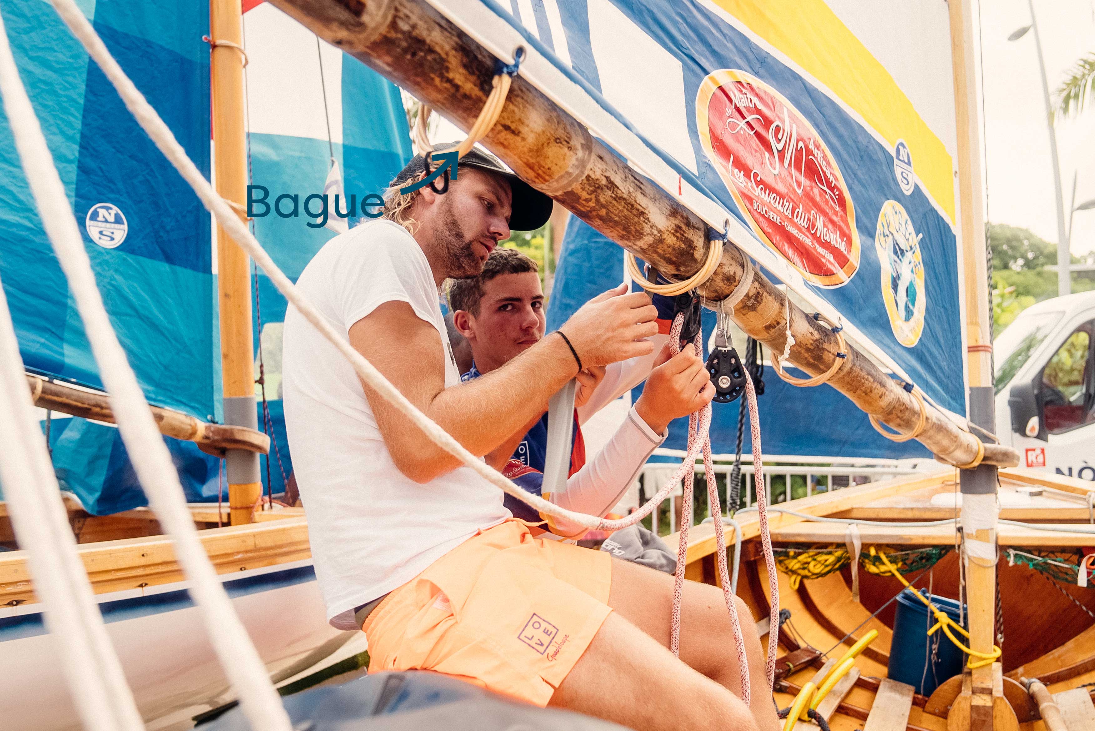 Les bagues sont de petits anneaux ou liens, traditionnellement fabriqués à partir de lianes locales appelées ailes de ravèt, qui servent à fixer solidement la grande voile au mât et au gui (la bôme) sur une saintoise.