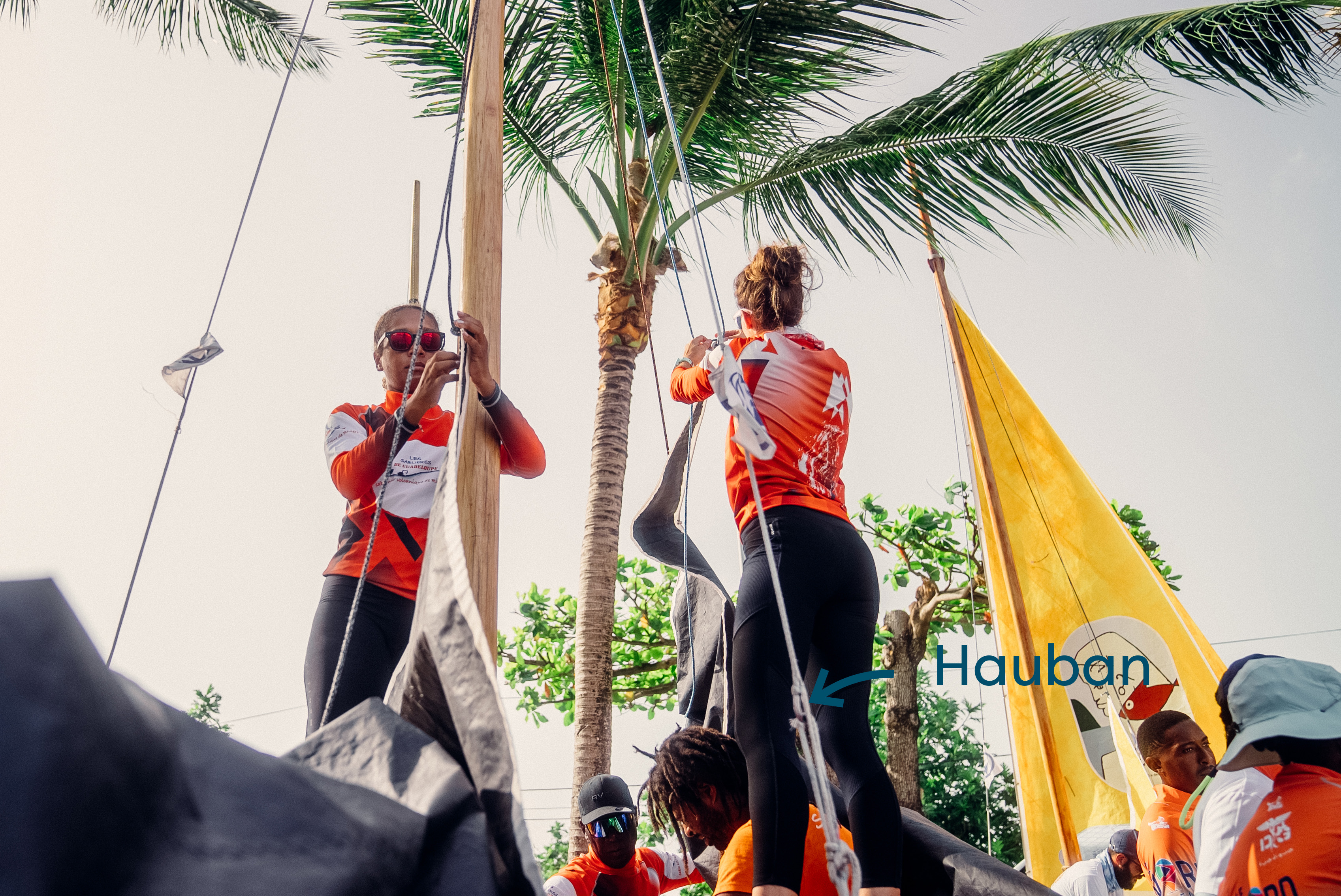 Il atteste que le canot appartient à la Classe des Canots Saintois de Voile Traditionnelle de la Guadeloupe, l'organisme qui régit cette discipline. Ce pavillon signifie que le canot a passé avec succès le contrôle de jauge, une inspection technique obligatoire qui vérifie le respect des dimensions, matériaux, gréement et autres critères définis par la classe. Ce contrôle garantit l’équité entre les embarcations lors des régates traditionnelles. Le pavillon de classe, souvent visible sur chaque haubans, est donc un symbole d’authenticité, de conformité et d'engagement sportif, signalant que le bateau est officiellement reconnu pour participer aux courses traditionnelles de voile dans l’archipel.