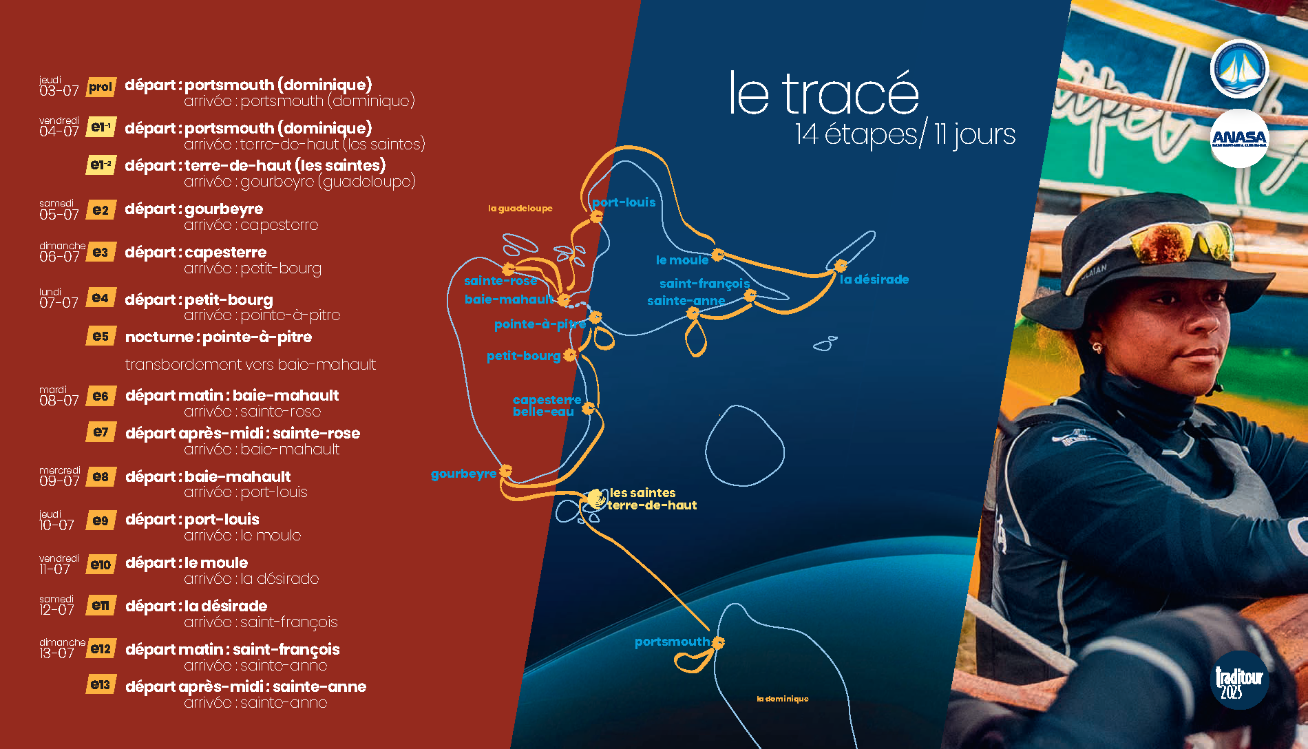 L’édition 2025 du Traditour s’annonce exceptionnelle et pleine de nouveautés. Cette année, l’événement marquera un tournant historique avec un départ inédit depuis l'île de la Dominique. Pour la première fois également, le parcours inclura un passage par la Désirade, ajoutant une touche nouvelle à cette aventure maritime emblématique.