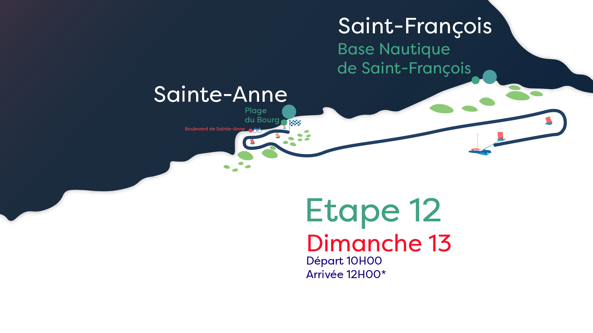 Avant-dernier acte en mer du Traditour 2025, cette douzième étape mènera les canots de la passe des Pêcheurs, au large de Saint-François, jusqu’à la base nautique de Sainte-Anne, berceau de l’ANASA, club organisateur de l’événement. Après un petit bord de près de dégagement au départ, les équipages s’élanceront pour une descente rapide le long de la côte sud de la Grande-Terre. Ce parcours d’environ deux heures, souvent marqué par des conditions clémentes, permettra à chacun de jouer ses dernières cartes avant l’épreuve finale de l’après-midi. À l’approche de Sainte-Anne, les concurrents devront négocier le passage par la Grande Passe, enrouler une bouée à Galbas, puis filer vers la ligne d’arrivée au bord de la plage du Bourg de Sainte-Anne. Un RIPAJ viendra conclure cette étape spectaculaire, sous les yeux des spectateurs. Le RIPAJ ? Cliquez, je vous explique tout !