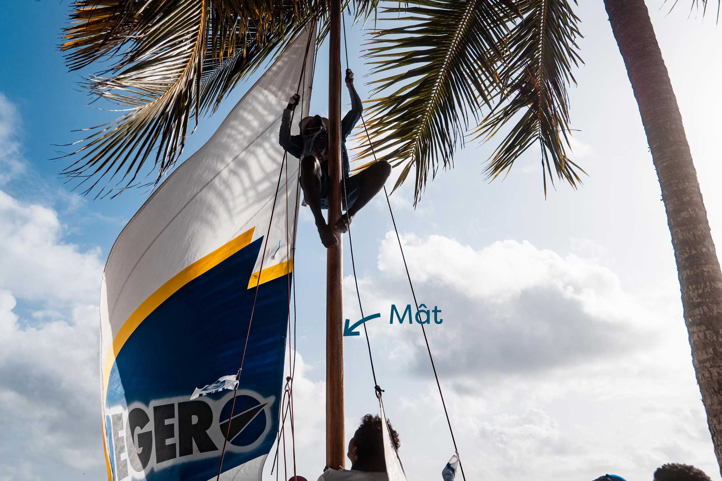 Sur une saintoise, il soutient à la fois la grande voile et le foc, assurant leur maintien en hauteur et leur bon déploiement. Généralement fabriqué en bois robuste ou en bambou, le mât est solidement fixé à la structure du bateau, car il doit résister aux tensions exercées par le vent sur les voiles. Sa hauteur et son inclinaison sont calculées pour optimiser la portance et la stabilité du canot. Il constitue l’axe central autour duquel s’organise toute la propulsion à voile du canot.