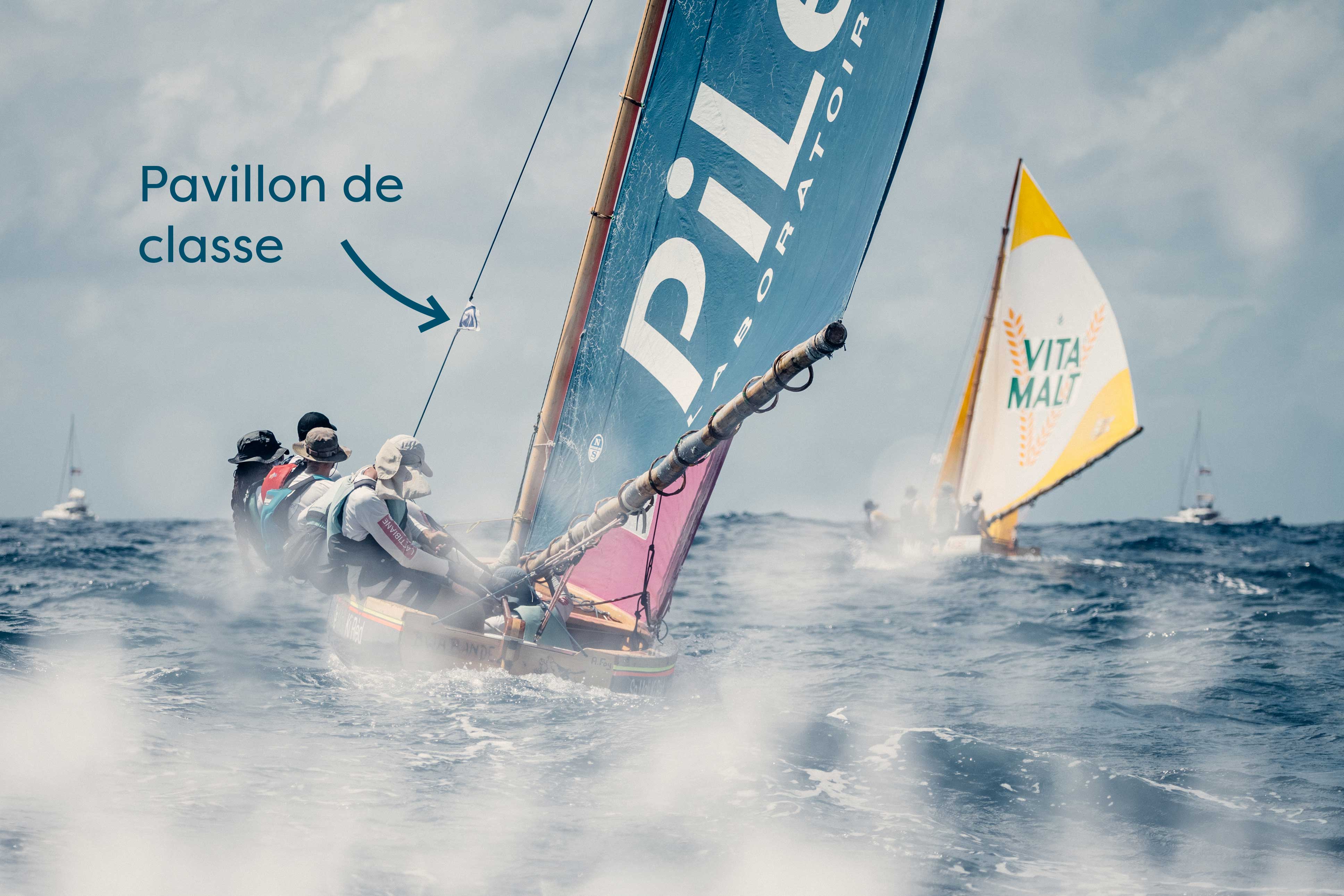 Il atteste que le canot appartient à la Classe des Canots Saintois de Voile Traditionnelle de la Guadeloupe, l'organisme qui régit cette discipline. Ce pavillon signifie que le canot a passé avec succès le contrôle de jauge, une inspection technique obligatoire qui vérifie le respect des dimensions, matériaux, gréement et autres critères définis par la classe. Ce contrôle garantit l’équité entre les embarcations lors des régates traditionnelles. Le pavillon de classe, souvent visible sur chaque haubans, est donc un symbole d’authenticité, de conformité et d'engagement sportif, signalant que le bateau est officiellement reconnu pour participer aux courses traditionnelles de voile dans l’archipel.