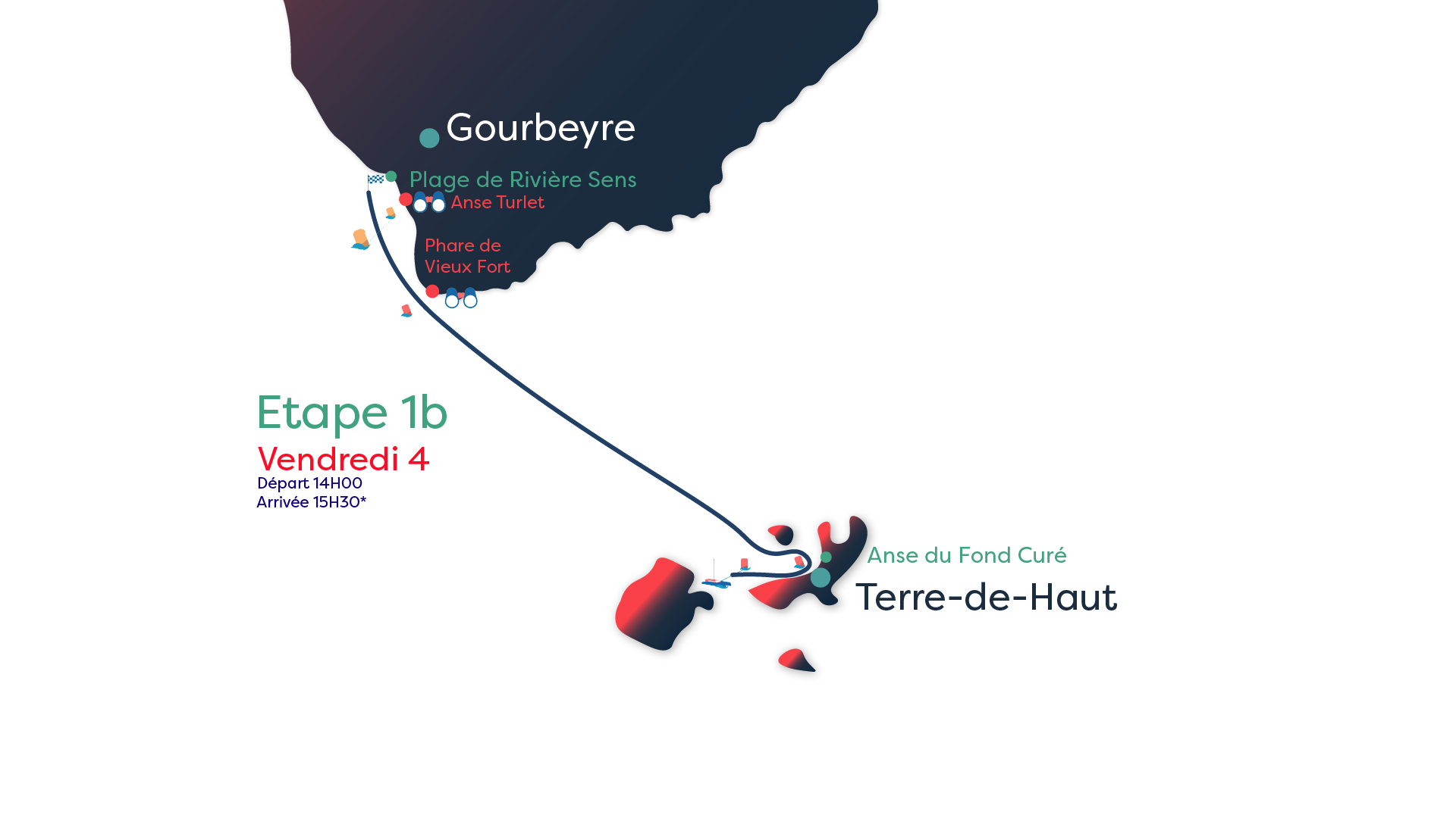 Après une pause bien méritée aux Saintes, les équipages reprendront la mer pour une traversée vers la Guadeloupe, entre l’Anse du Fond Curé et la plage de Rivière-Sens à Gourbeyre. Si cette seconde partie de l’étape du jour peut sembler plus accessible, elle n’en reste pas moins piégeuse. Les corps sont déjà éprouvés par la traversée du canal de la Dominique, et les pièges de la côte sous le vent sont bien connus des navigateurs aguerris. Aux abords du phare de Vieux-Fort, les vents deviennent irréguliers et la lecture du plan d’eau devient cruciale. Et pour conclure cette première journée intense, une nouveauté de l'édition 2024 attendu par les spectateurs et les équipages à Gourbeyre : le RIPAJ. Cette étape est la première étape de la compétition avec, le RIPAJ. (Vous ne savez pas ce qu'est le RIPAJ ? Cliquez, je vous explique tout !)